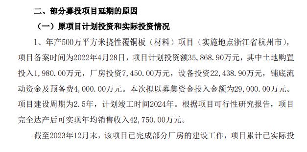 “年產(chǎn)500萬(wàn)平方米撓性覆銅板(材料)項目”已完成部分廠(chǎng)房的建設工作,原計劃于2024年12月投產(chǎn),現公司決定進(jìn)一步提升新建廠(chǎng)房的潔凈度裝修等級,因生產(chǎn)車(chē)間的內部裝修將耗費更長(cháng)的時(shí)間才能達到交付安裝設備的條件,故將項目延期至2025年底投產(chǎn)。