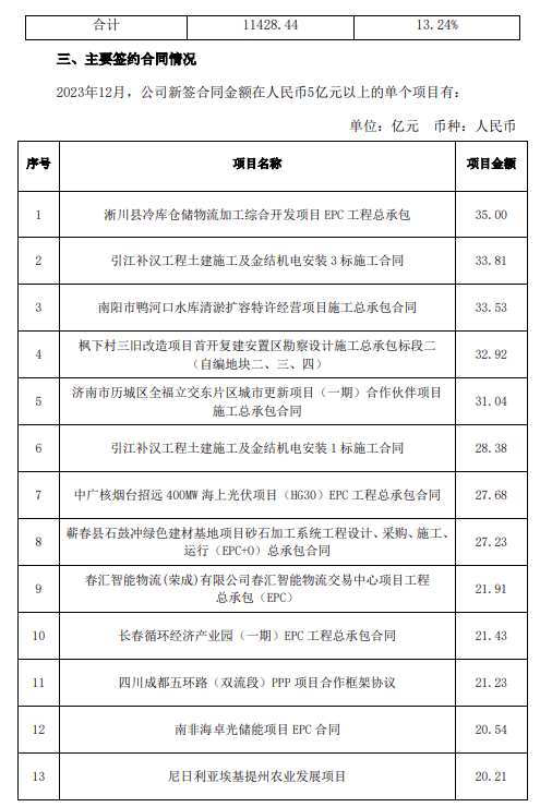 1月25日,中國電建發(fā)布公告稱(chēng),2023年公司新簽項目8217個(gè),新簽合同金額11428.44億元。其中,能源電力新簽項目數量4590個(gè),基礎設施類(lèi)1566個(gè),新簽合同金額3360.25億元。
