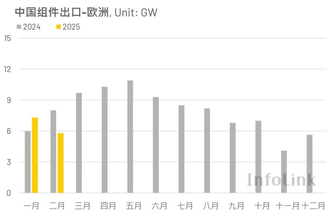 2025 年 1 月中國共出口歐洲市場(chǎng)約 7.31 GW 的光伏組件,與 2024 年 1 月的 5.98 GW 相比上升 22%;二月則出口約 5.8 GW 的光伏組件,與去年二月的 8.05 GW 相比下降 28%。截至今年二月底,中國一至二月共出口歐洲市場(chǎng)約 13.11 GW 的光伏組件,同比去年 14.03 GW 下降 7%。